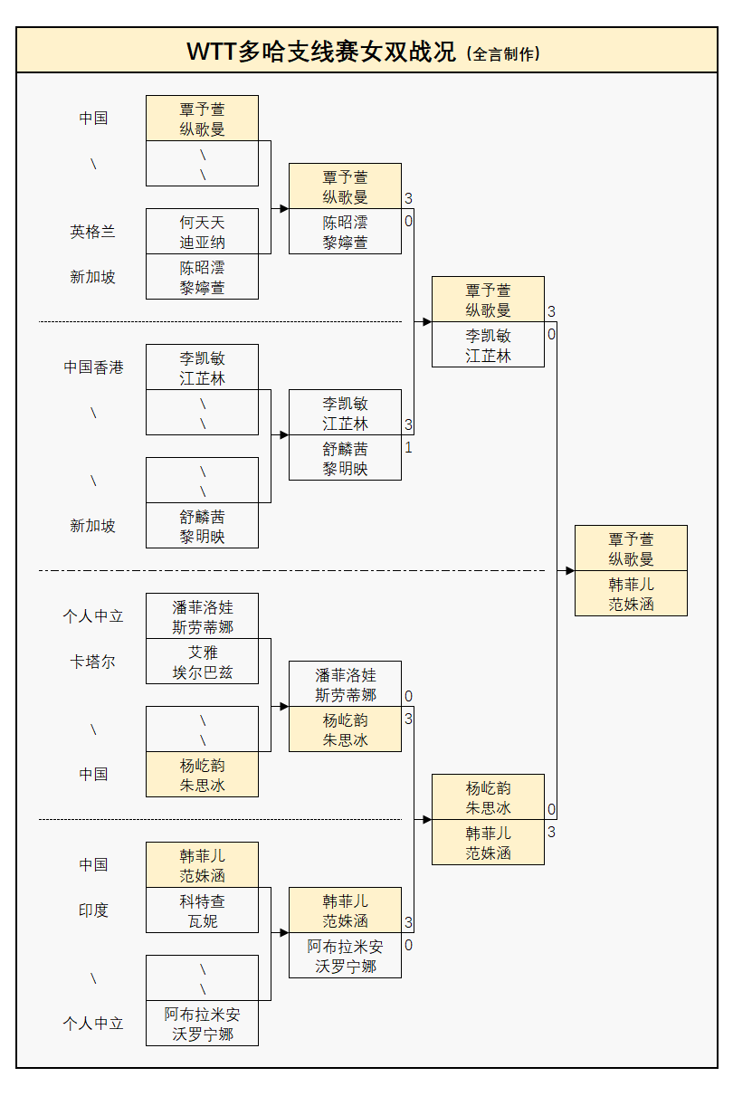 女双:杨屹韵/朱思冰3-0潘菲洛娃/斯劳蒂娜(个人中立)、韩菲儿/范姝涵3-0阿布拉米安/沃罗宁娜(个人中立)、覃予萱/纵歌曼3-0陈昭澐/黎嬋萱(新加坡);