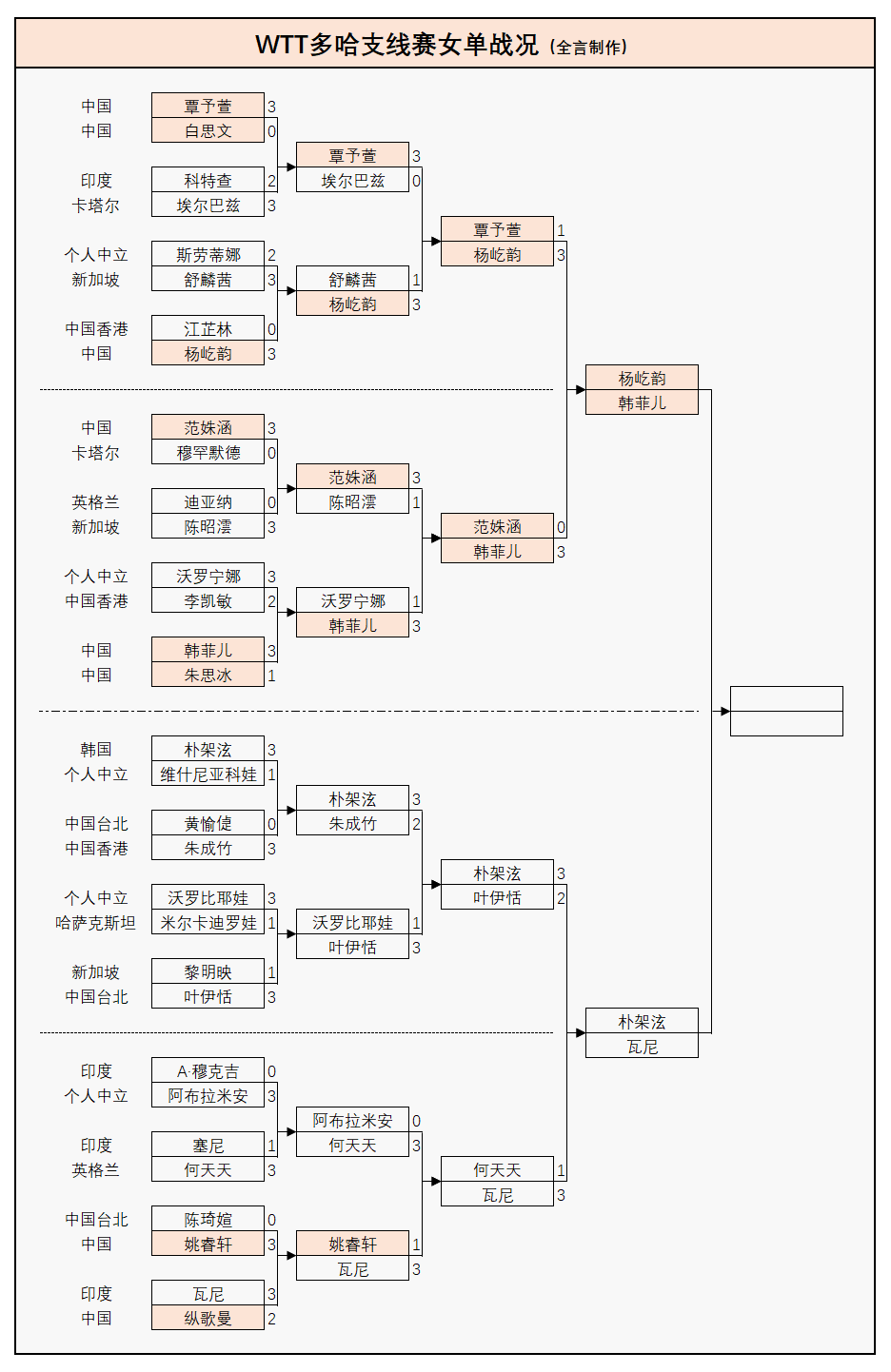 女单:杨屹韵3-1覃予萱、韩菲儿3-0范姝涵;