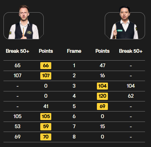 同时段,另一场比赛,机长卡特打出一杆破百和两杆50+,同样是5-1大胜老将宾汉姆。