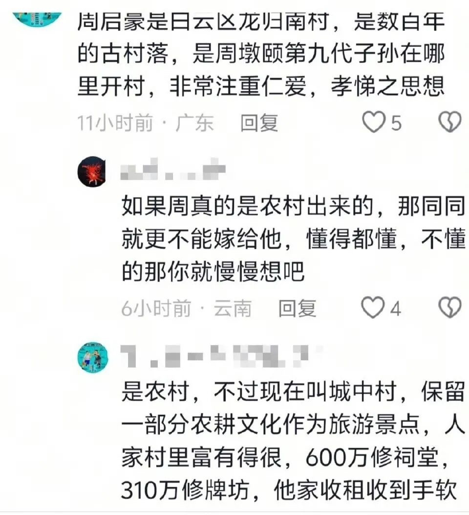 不过有知情人士爆料,周启豪家虽然是农村的,但属于广州白云区的城中村,保留一部分农耕文化作为旅游景点,村里很富有,600万修祠堂,310万修牌坊,他家收租收到手软。