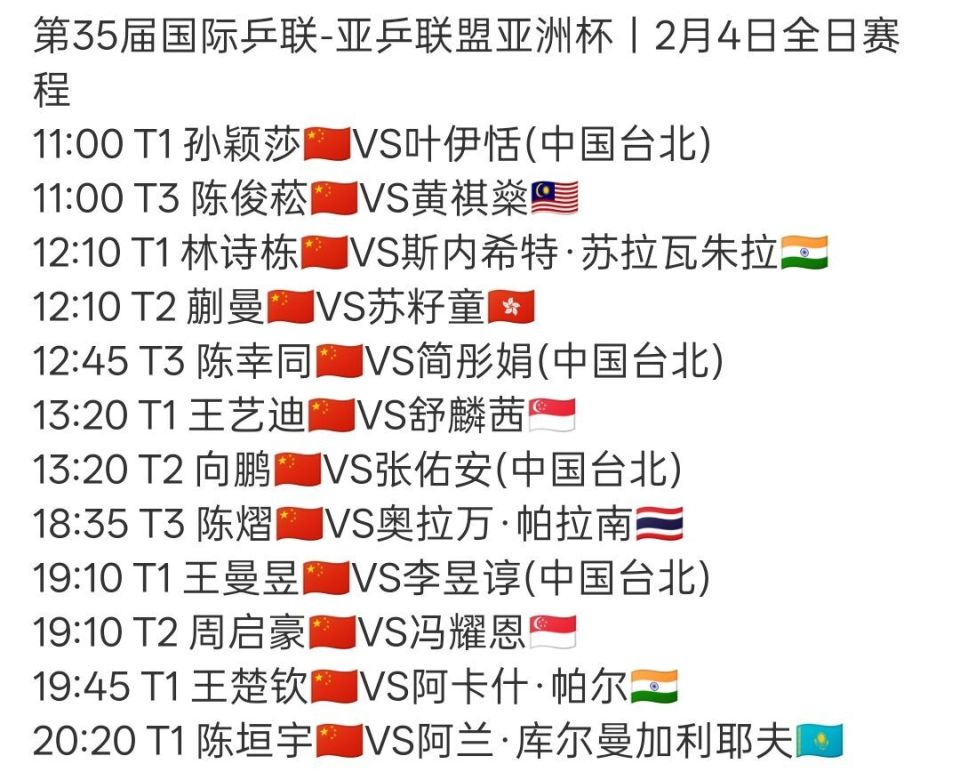 乒乓亚洲杯:2月4日赛程公布!国乒12人出战,王楚钦+孙颖莎登场