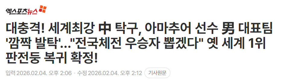 韩国媒体“体育东亚”4日称,在中国男乒被外界诟病“遭遇史上最弱时期”的背景下,中国乒协显然将征召樊振东复出视为扭转战局的“杀手锏”。一位在国际乒联(ITTF)世界排名榜上查无此人的业余选手,成功入选将于4月28日至5月10日在英国伦敦举办的2026年世界乒乓球锦标赛(团体赛)中国男队参赛名单。