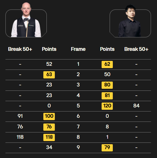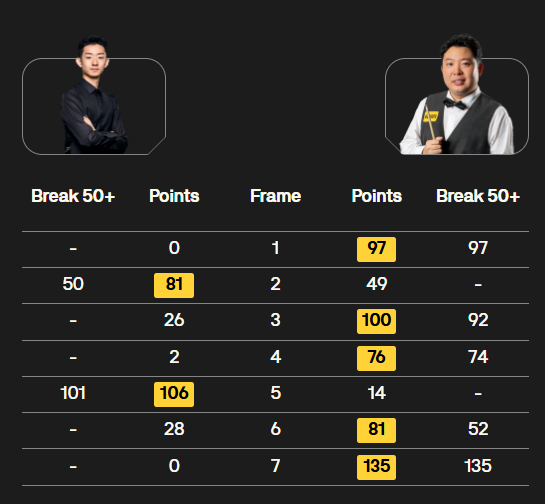 吴宜泽和张安达的比赛,首局,吴宜泽一杆瞎打,张安达打出单杆97分。第2局,张安达错失制胜机会,吴宜泽单局逆转,扳平比分。随后两局,张安达抓住吴宜泽失误,连续打出两杆70+,3-1领先。