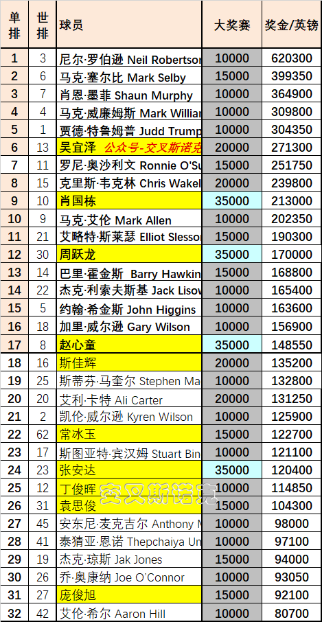世界大奖赛变身“中国”大奖赛,喜庆之余,简单看一眼目前的单赛季排名和半决赛球员交手记录。