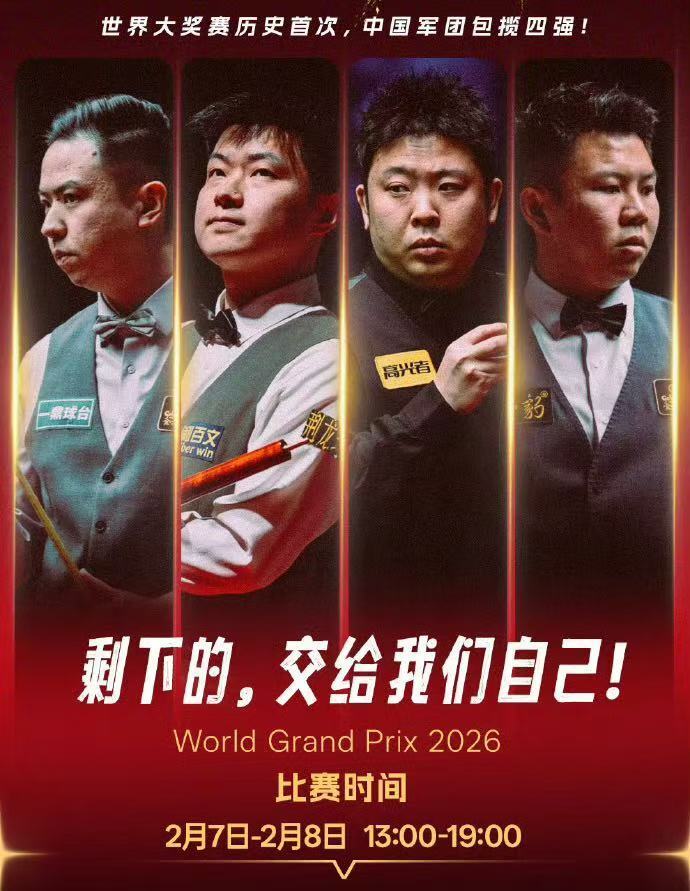 北京时间2月6日晚,2026斯诺克世界大奖赛1/4决赛在中国香港战罢,肖国栋、张安达、赵心童、周跃龙四位中国选手历史性包揽四强。