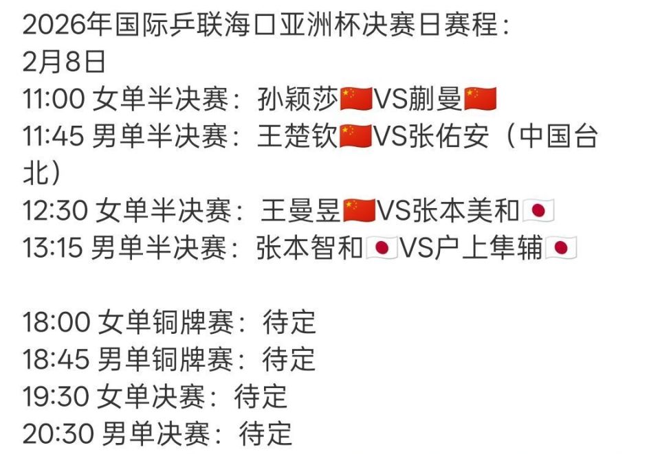 乒乓球亚洲杯:2月8日赛程公布!将诞生两项冠军,国乒迎战张本美和