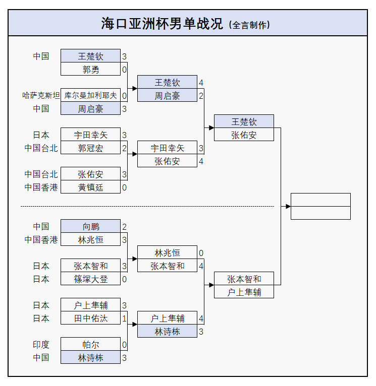 至于国乒男单更是情况不妙,小组赛陈俊菘0-3输日本的宇田幸矢,陈垣宇0-3输日本的户上隼辅、2-3输印度的巴特查尔吉,两人由此而无缘出线;1/8决赛向鹏2-3输中国香港的林兆恒,1/4决赛林诗栋3-4输日本的户上隼辅。在周启豪输队友后,国乒仅剩1人晋级该项目的半决赛: