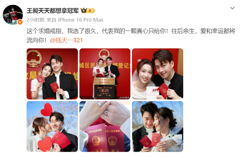 对了,钱天一还为这一段求婚视频配上了一段话:生日愿望是嫁给你,睁眼就实现了。由此可见,钱天一对王昶也是情有独钟,早就想嫁给他了。在求婚成功后,王昶也更新了自己的社交媒体,他直言“这个求婚戒指,我选了很久,代表我的一颗真心只给你!往后余生,爱和幸运都将流向你!”。听听这肉麻的话,多么撩人心扉。王昶的配图则是两个人领结婚证的瞬间。