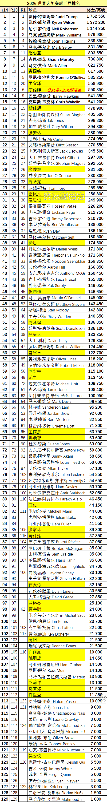 具体排名如下:(排名最终以世界斯诺克官网公布的为准)