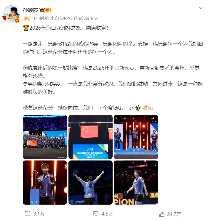 北京时间2月9日,亚洲杯金牌选手孙颖莎发布了长文,回顾2026年海口亚洲杯之旅,圆满收官。王曼昱的坚韧和实力一直是我非常尊敬的,我们彼此激励,共同进步,这是一种超越胜负的美好。