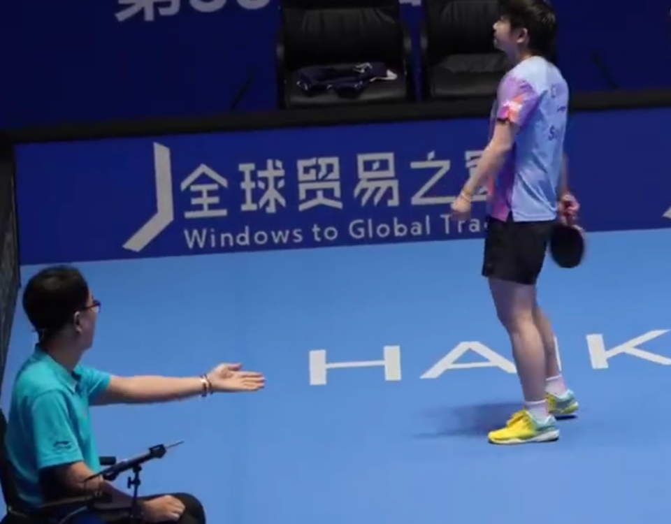 孙颖莎发现这一分已经给王曼昱加上后,孙颖莎向裁判申诉‘这球擦边了’,王曼昱好像没有看到这球,王曼昱有一个摊手的动作。