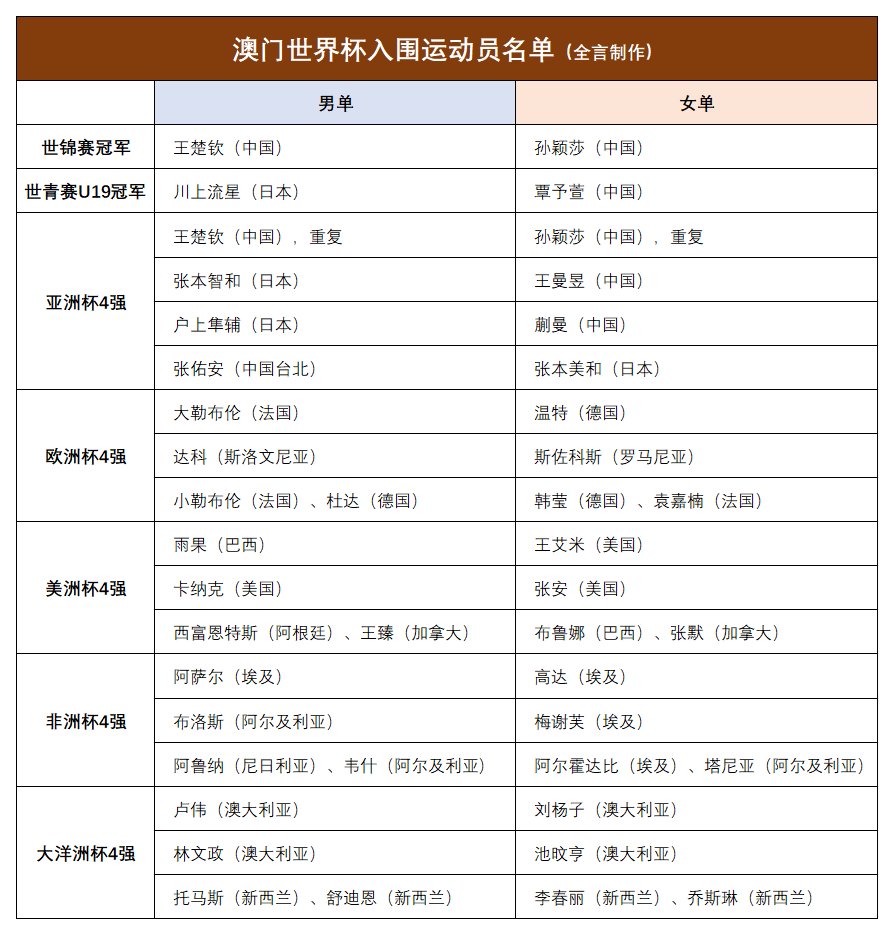 由于王楚钦、孙颖莎此前已经通过世乒赛单打冠军入围,所以名额出现重复情况。