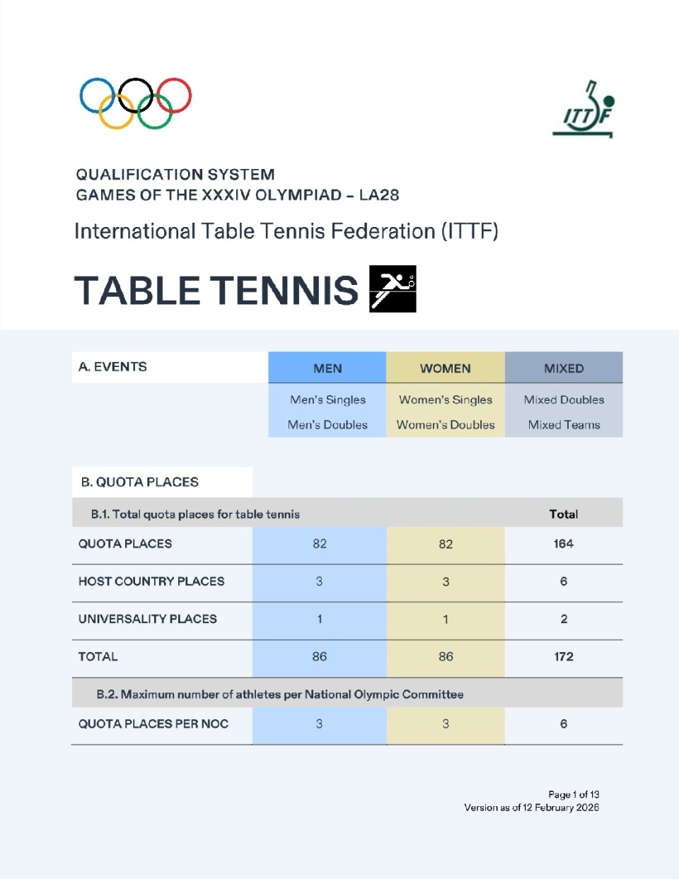 国际奥委会日前公布了2028年洛杉矶奥运会乒乓球资格获取方案。乒乓球设男女单打、男女双打、混双和混合团体6个项目,各队满额席位总数为6人(男女各3人),其中男女单打各2人、男女双打各1对、混双2对(需均在世界前八)、混团男女各3人。大致获取方案如下: