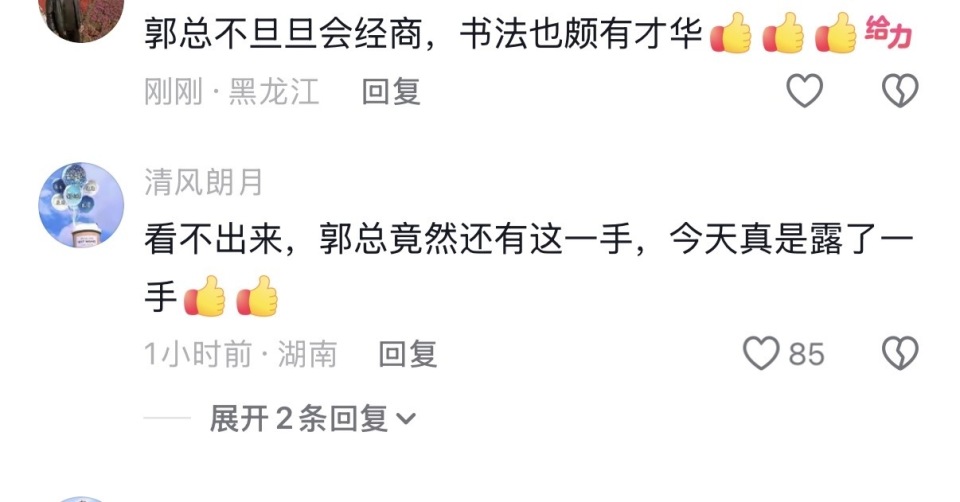 不少网友感叹,郭总真是厉害。不仅会经商、在书法上也颇有造诣。看不出来,郭总还有这一手,真是开眼了。
