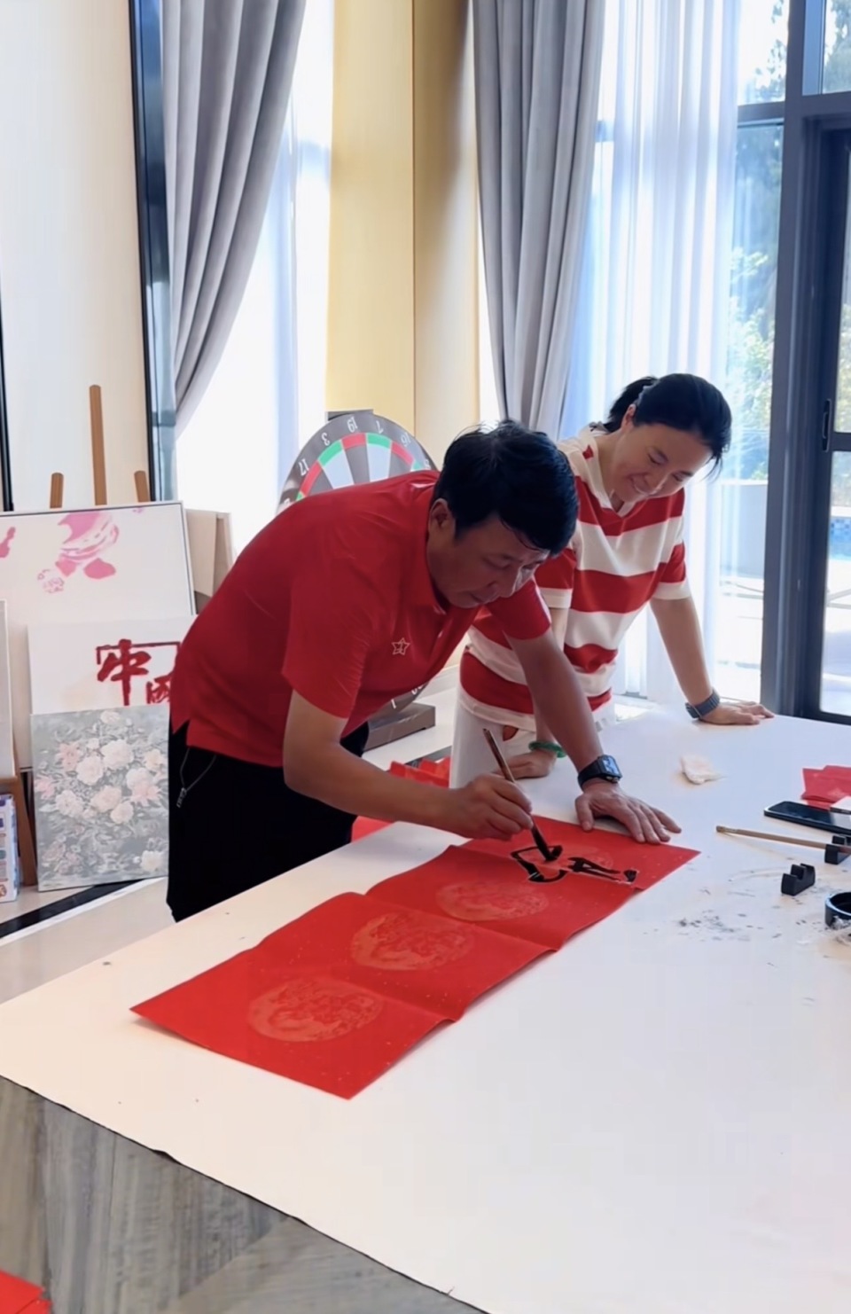 郭斌亲自动手写对联,这模样就像一位艺术家,他和王楠的儿子才15岁,已经知道帮着爸爸向上抽拉对联纸了。