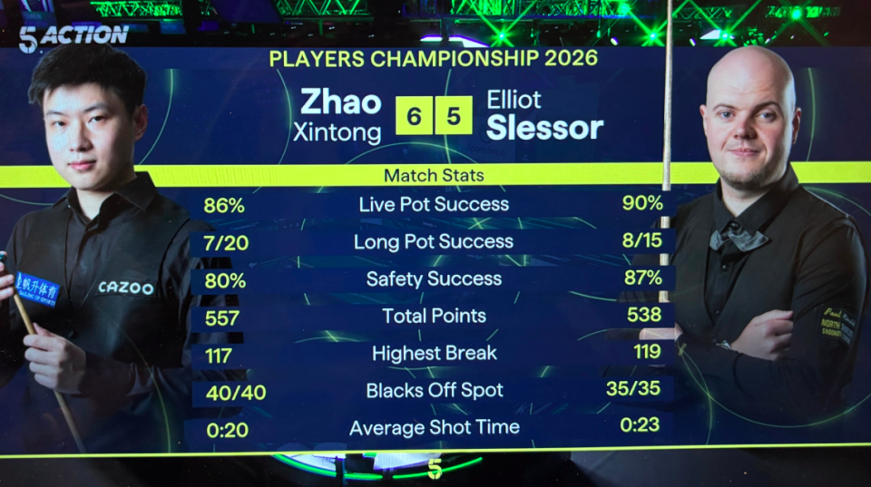 北京时间2月19日凌晨,2026年斯诺克球员锦标赛,1/8决赛,中国选手赵心童对阵英国选手斯莱瑟。在2-5的绝境之下,赵心童打出天王级的表现,最终6-5逆转晋级!