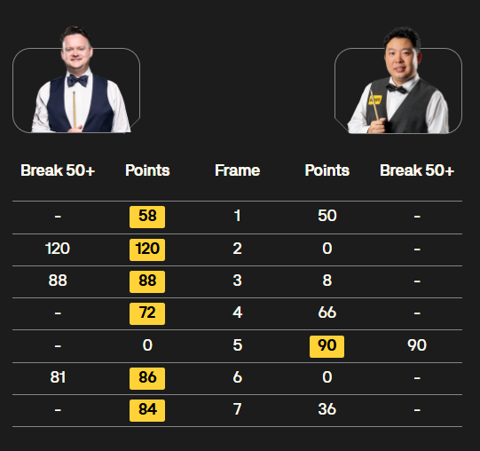 短休后,第5局,张安达单杆90分制胜,这是晚场比赛,中国球员拿到的唯一一局。此后,墨菲打出一杆81分,连赢两局,6-1大胜张安达。