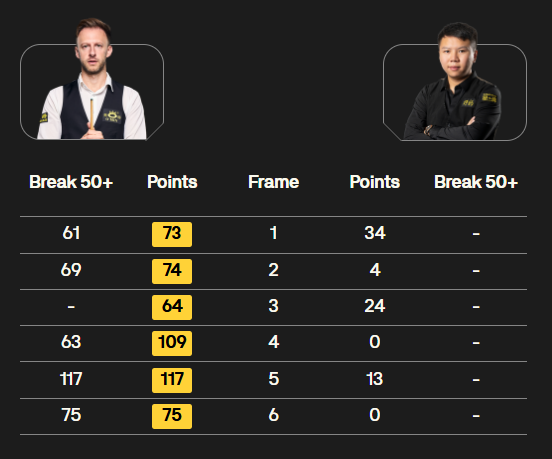 周跃龙毫无招架之力,特鲁姆普打出一杆破百和4杆50+,6-0横扫周跃龙。