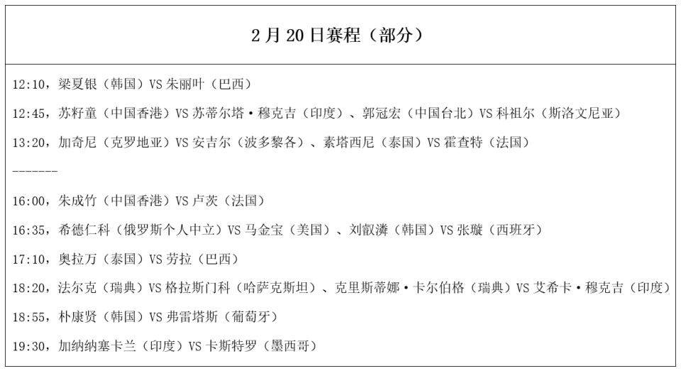 根据安排,2月20日上半场仍然是单打资格赛首轮的较量,比较有看点的场次有: