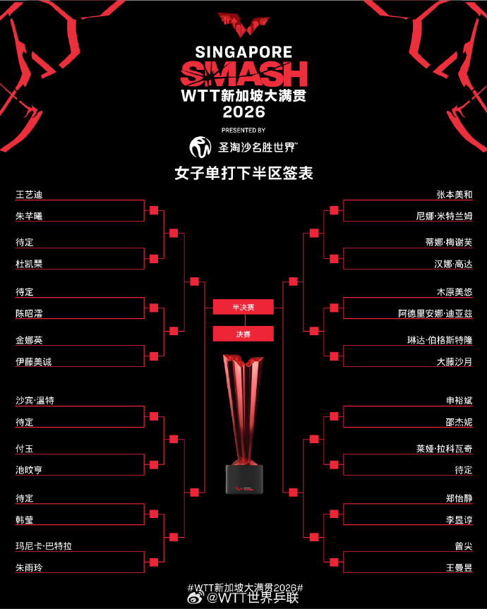 王曼昱与王艺迪位于下半区,该半区还有张本美和、朱雨玲、申裕斌等名将。
