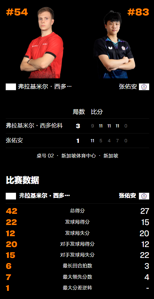 2026年2月21日晚,乒乓球WTT新加坡大满贯赛正火热进行,不久前才在海口亚洲杯上爆冷闯入男单4强的中国台北黑马张佑安已经结束战斗,在资格赛最后一轮1-3不敌俄罗斯个人中立选手、新科大运会男单冠军希德仁科(或译名西多伦科),无缘继续闯关冲击冠军,详细战况请看下文。