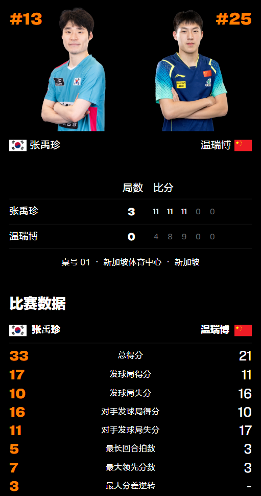 2026年2月22日,国乒在WTT新加坡大满贯赛上的首败诞生,19岁年轻新星温瑞博苦战后0-3被横扫,不敌韩国队头号主力张禹珍,由此而一轮游止步男单64强无缘冲击冠军,张禹珍也在1月单打战胜林诗栋、双打淘汰林诗栋/梁靖崑后再破国乒防线,的确有威胁!详细战况请看下文。
