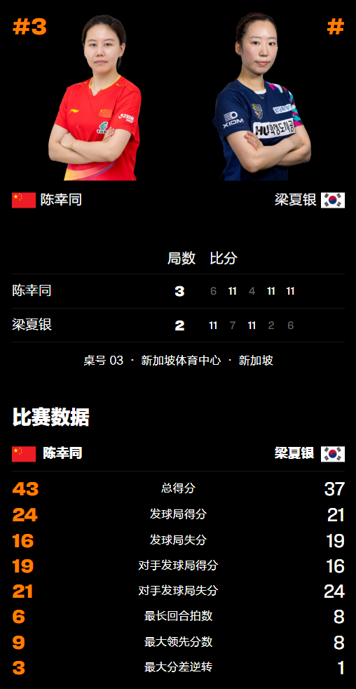 2026年2月22日,乒乓球WTT新加坡大满贯赛爆发中韩世界冠军之战,国乒选手陈幸同在大比分0-1、1-2落后的情况下上演逆转,最终3-2险胜韩国名将梁夏银,由此而晋级女单32强继续冲击冠军,的确赢得不轻松!详细战况请看下文。