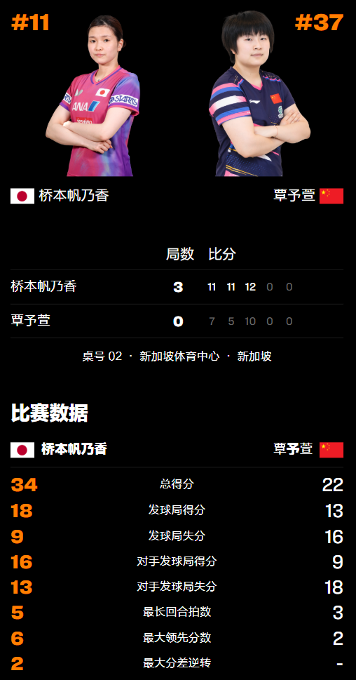 第三局胜利在望桥本帆乃香出现较多失误,但覃予萱在领先后未能稳住阵脚被追至5-5平于是叫出暂停进行调整。再次投入比赛后,国乒小将再次领先被咬住比分,随后双方战至9-9平,再得1分后错失局点被追至10-10平,最终以10-12结束战斗,职业生涯第5次被桥本帆乃香零封。