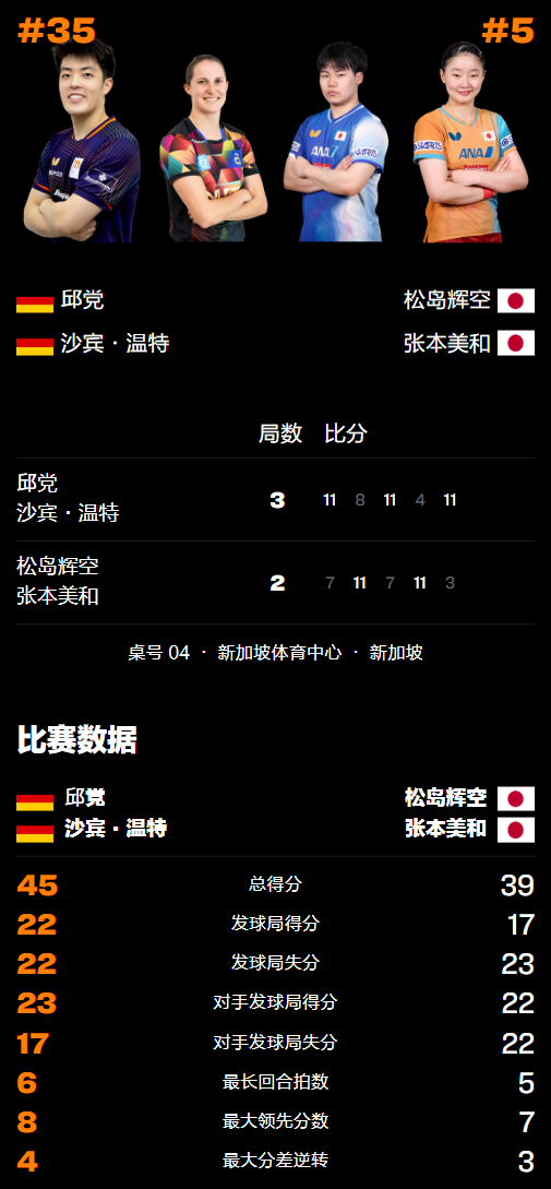 2026年2月23日,乒乓球WTT新加坡大满贯赛爆发焦点之战,日本主力组合松岛辉空/张本美和在首秀中苦战5局被淘汰,最终2-3不敌德国的邱党/温特,由此而一轮游结束战斗止步16强,同时也造就了各自在本站比赛上的首场败绩,详细战况请看下文。