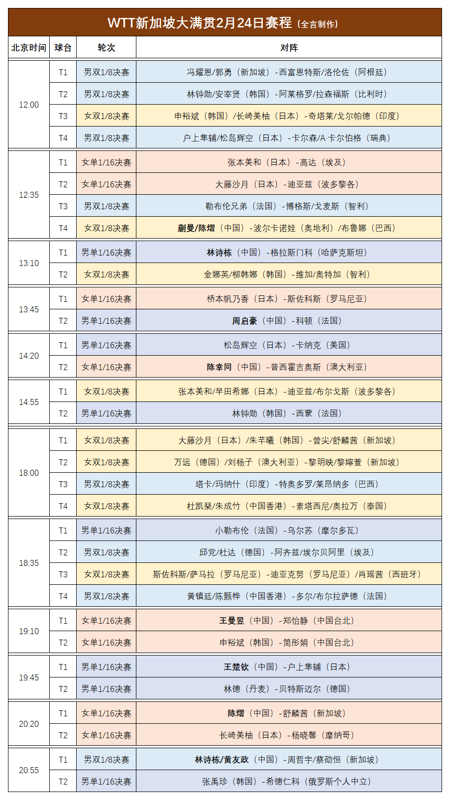 根据安排,2月24日国乒将迎来6场单打对决和2场双打比赛,详情如下:
