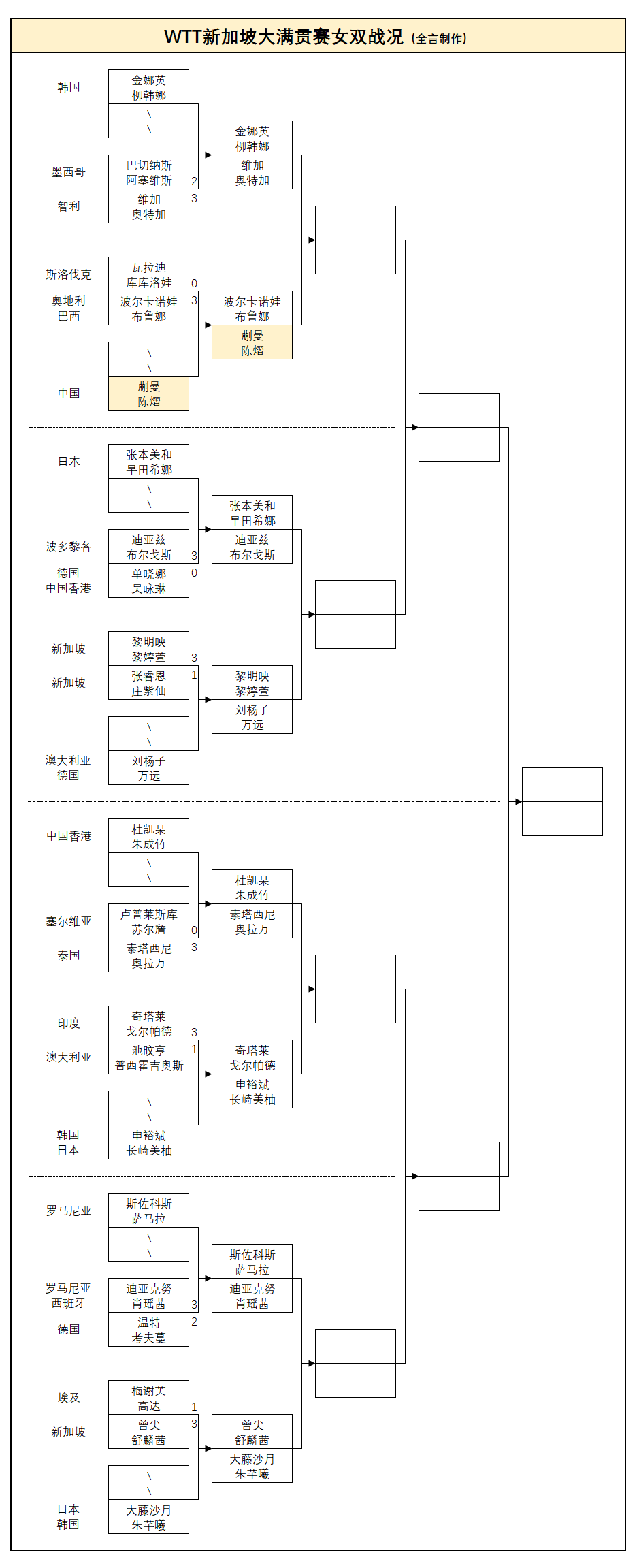 波尔卡诺娃/布鲁娜虽然是名将配对,但毕竟是跨国合作,默契度可能大打折扣,蒯曼/陈熠正常发挥的话应该能拿下;科顿有一定冲击力,周启豪不可小觑;普西霍吉奥斯和东道主球队的舒麟茜、周哲宇/蔡劭恒威胁不大,陈幸同、陈熠、林诗栋/黄友政晋级有保障。