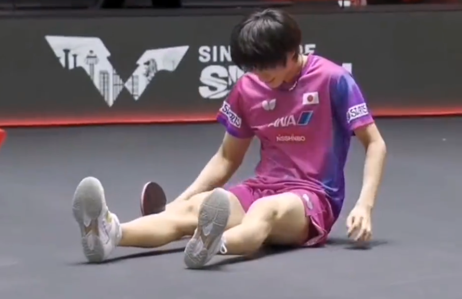 第二局7-6,王楚钦发球。户上隼辅接发后,王楚钦突然变线,一板反手撕到正手大角度。户上拼命横向移动,脚下一滑,整个人直接坐在了地上。球从他头顶飞过,落地得分。那几秒钟里,他仰着头,看着球飞向身后的方向,眼神里写满了问号:我是谁?我在哪?刚才发生了什么?