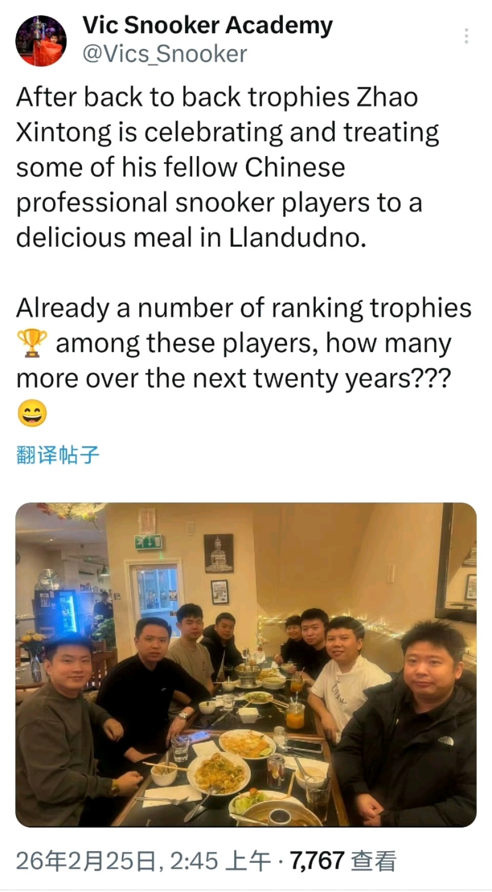 聚餐期间,赵心童与肖国栋等6名球员合影。值得一提的是,这7名中国球员全部打进了威尔士公开赛的第二轮。国外媒体感叹:“这群中国球员已经拿到了不少的冠军。未来20年,他们还会问鼎多少项赛事呢?”此前,台球皇帝亨得利曾预言中国球员迟早会统治斯诺克这项运动。