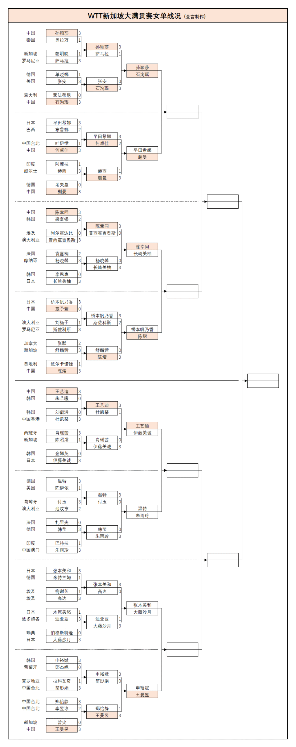 女单:覃予萱0-3桥本帆乃香(日本)、何卓佳2-3早田希娜(日本);