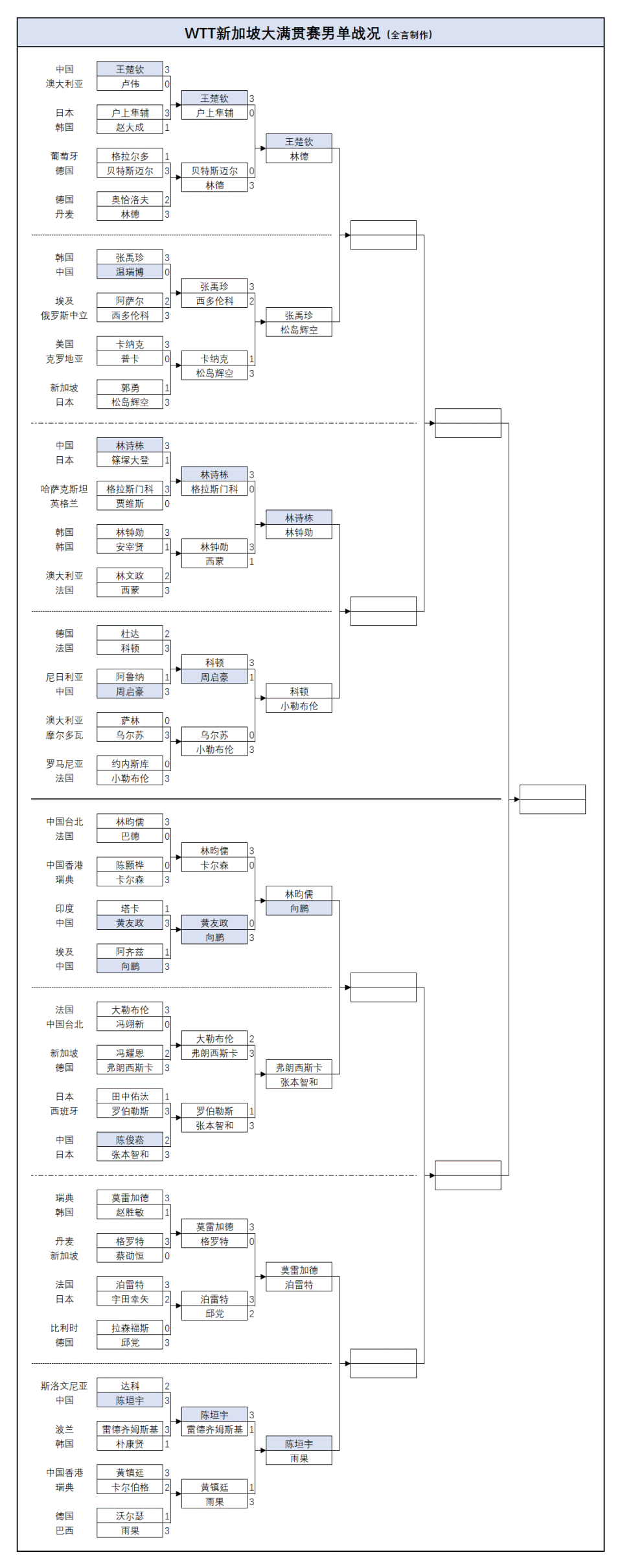 男单:温瑞博0-3张禹珍(韩国)、陈俊菘2-3张本智和(日本)、周启豪1-3科顿(法国);