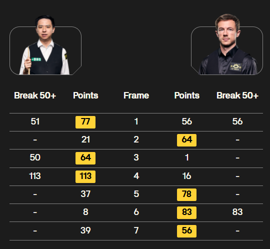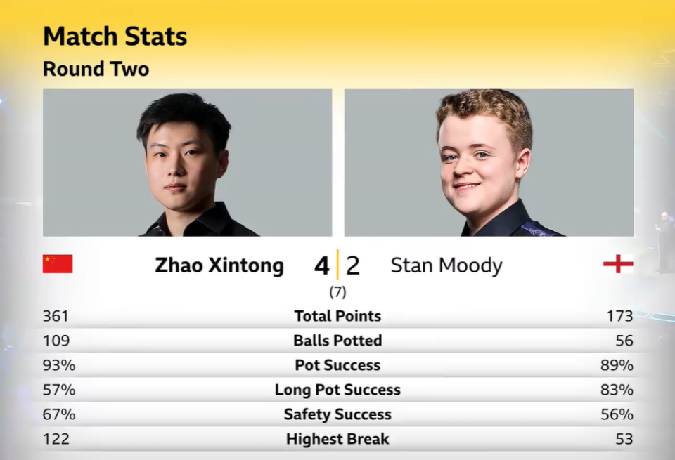 凌晨时段,赵心童出场对阵英国新星斯坦·穆迪。前三局,赵心童打出3杆50+,3-0到赛点。第4局,穆迪两次上手,扳回一分。第5局,穆迪两记长台、两次上手,再救一个赛点。第6局,赵心童一杆破百,4-2终结比赛。