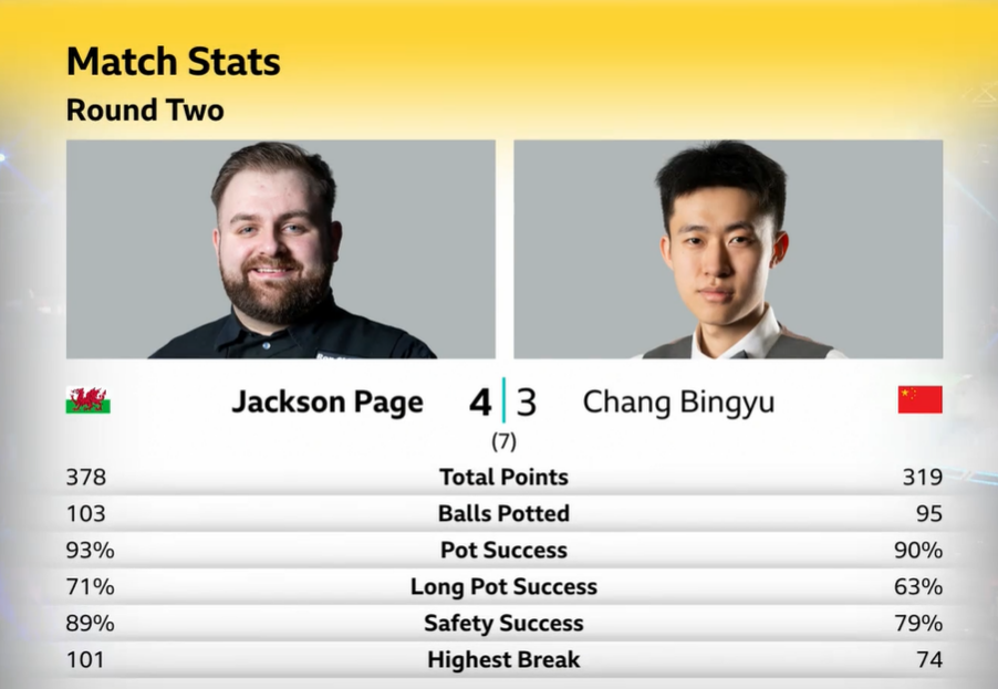 第三时段,上一场连四破百、横扫墨菲的常冰玉对阵杰克逊·佩奇。常冰玉单杆65分拿下首局;随后,常冰玉连丢两局,其中第3局,打丢1分单局逆转的好机会。1-2后,常冰玉连胜两局先到赛点。第6局,佩奇破百追平。