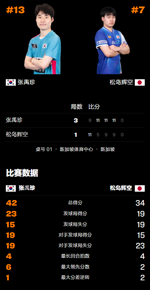 2026年2月26日,乒乓球WTT新加坡大满贯赛爆发首场单打1/8决赛,日韩两大全国冠军主力松岛辉空、张禹珍狭路相逢,结果双方激战4局后松岛辉空1-3被逆转淘汰,张禹珍由此而锁定第一个单打8强席位,不愧为最近连赢国乒运动员的名将,详细战况请看下文。