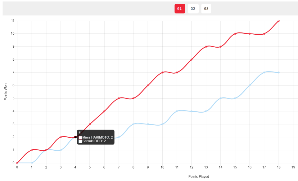 这场比赛两人开场2-2,大藤沙月随后2-5落后,之后张本美和7-2拉开差距,紧接着张本美和9-4继续领先,张本美和10-5拿到局点,最终11-7先下一城。
