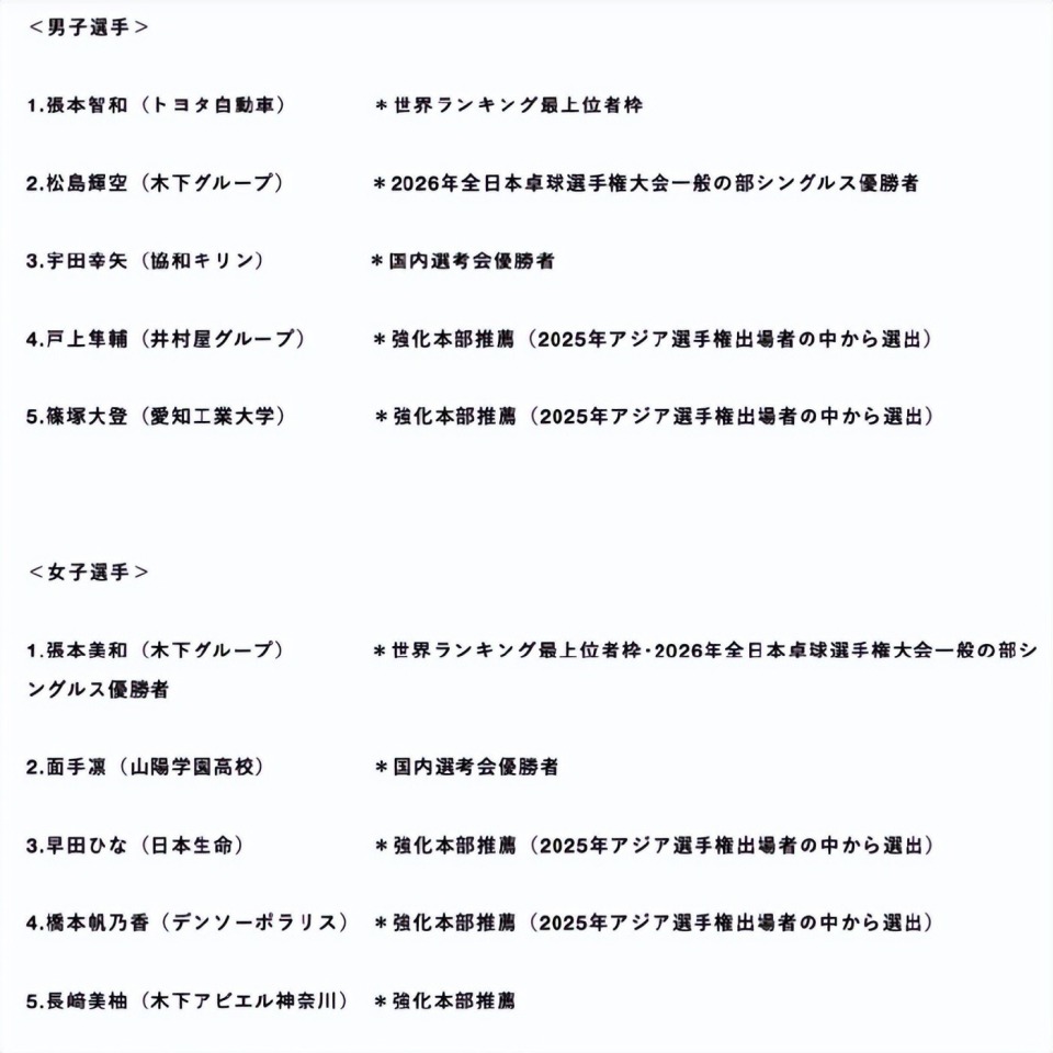日乒官方一天前公布了伦敦世乒赛团体赛的名单,女团:张本美和、面手凛、早田希娜、桥本帆乃香、长崎美柚 ;也就是说亚洲杯、世乒赛大藤沙月都未能参与。