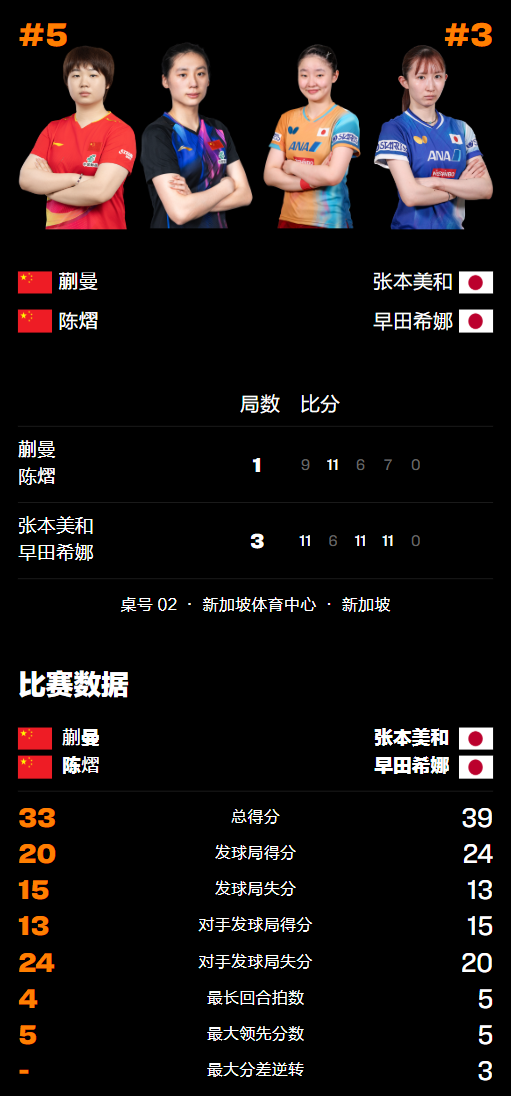 第四局国乒组合背水一战依旧不断落后,最终未能突破张本美和/早田希娜防线以7-11被淘汰,中国队由此而连续无缘混双、女双冠军。