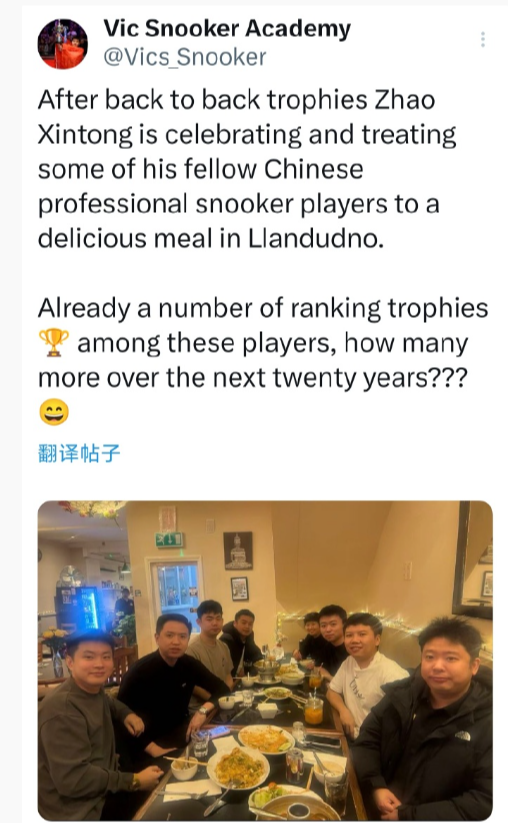 对于赵心童而言,这顿聚餐既是夺冠后的放松,也是对同门的鼓励。作为中国首位斯诺克世界冠军,他始终以榜样的姿态引领着后辈。而对于其他中国球员来说,与这位好兄弟的相聚,既是交流球技的契机,也是汲取力量的时刻。在异国他乡的赛场,这样的同胞情谊,无疑是他们前行路上最坚实的后盾。