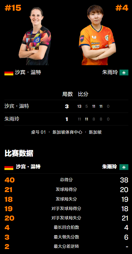 温特(德国)3-1朱雨玲(中国澳门):13-11、5-11、11-8、11-8。