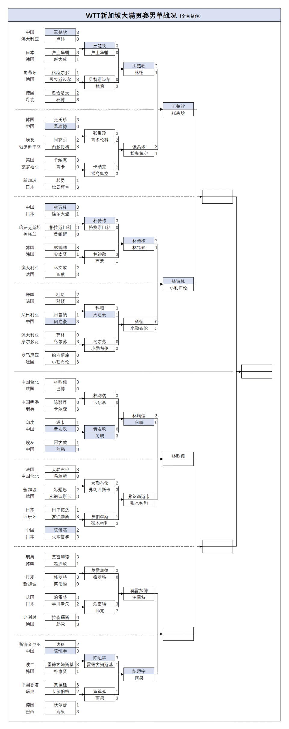 目前王楚钦、林诗栋、王曼昱、陈幸同、王艺迪已经在第三轮分别战胜丹麦的林德、韩国的林钟勋与申裕斌、日本的长崎美柚与伊藤美诚率先晋级8强,单打晋级形势如下:
