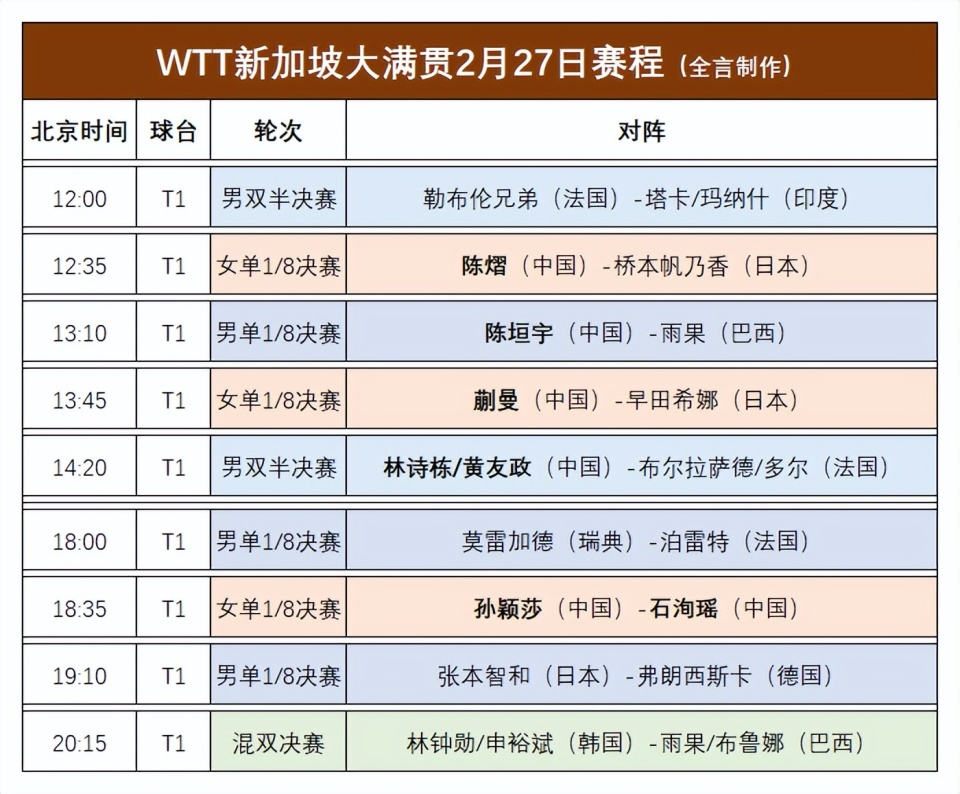 WTT新加坡大满贯2月27赛程:陈熠迎战桥本帆乃香,陈垣宇PK雨果