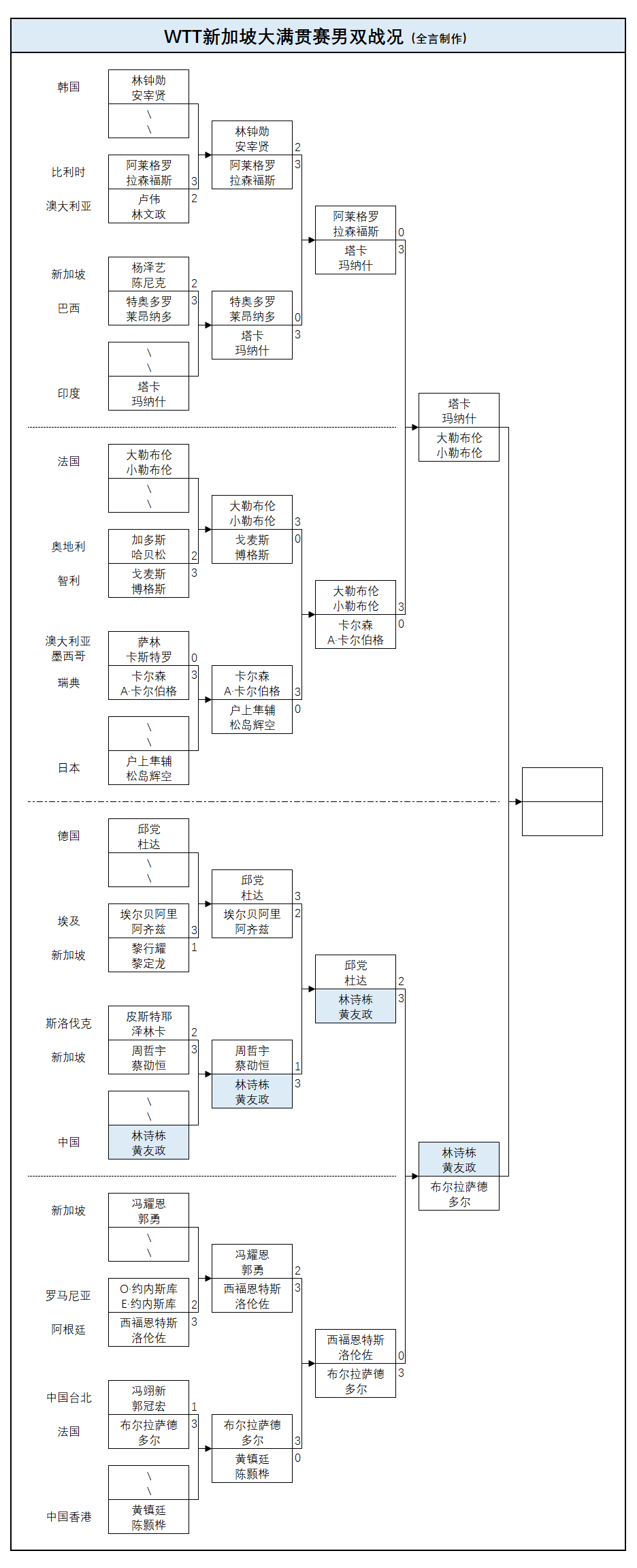 目前混双、女双决赛名单已经出炉,由韩国的林钟勋/申裕斌对阵巴西的雨果/布鲁娜、日本的张本美和/早田希娜迎战申裕斌(韩国)/长崎美柚(日本)——三项双打战况如下: