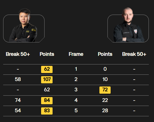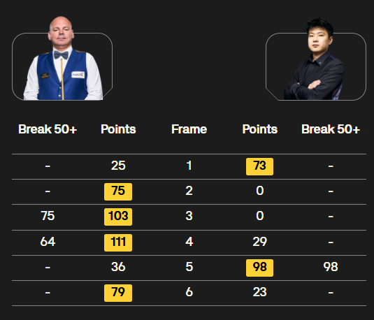 第5局,宾汉姆打丢一杆制胜机会,赵心童准度回暖,一杆98分清台,扳回一分。第6局,宾汉姆两次打丢制胜机会,但赵心童也是出现两个失误。最后,宾汉姆通过斯诺克获机会,第三次上手,锁定胜局,4-2获胜,终止赵心童的连胜。