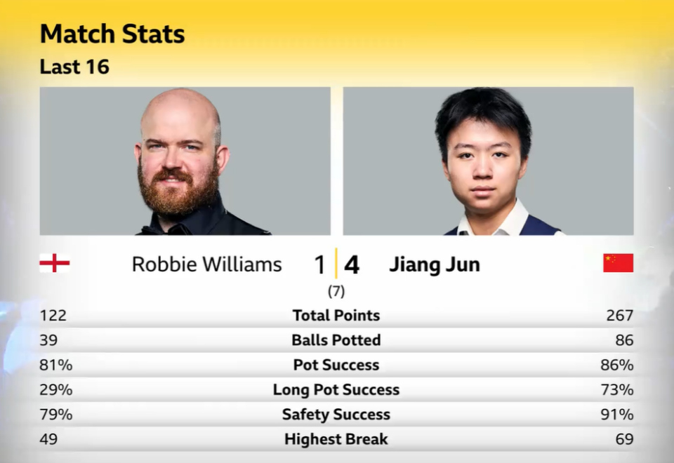 首时段,江俊对阵罗比·威廉姆斯,双方失误不少,但江俊准度更优,尾局,江俊准进超分红球,单杆69分制胜,4-1获胜。这是继2025年苏格兰公开赛后,江俊第二次晋级排名赛八强。