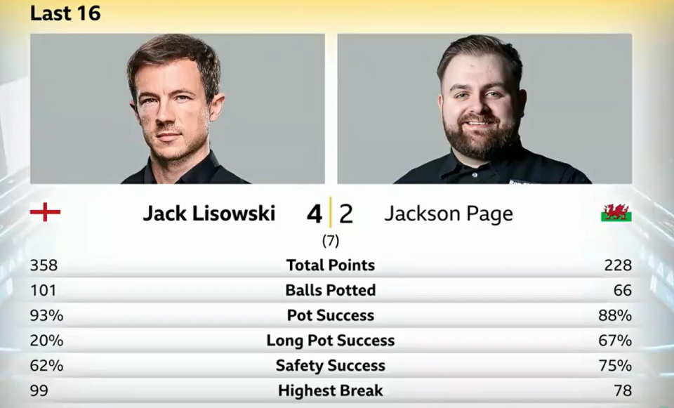 另一场,前两场状态不佳的利索夫斯基,本场对阵杰克逊·佩奇,打出不错的进攻手感,4杆50+,4-2获胜。全场进球成功率,利索夫斯基是93%。