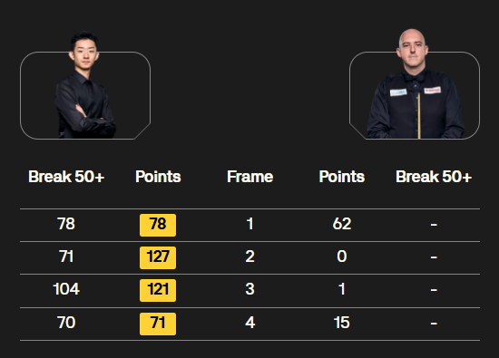 周跃龙和山姆·克雷吉的比赛,最晚结束。周跃龙3-1后,尾局,尽管单杆54分后出现简单球失误、打丢一杆制胜的机会,但最终4-1锁定胜利。